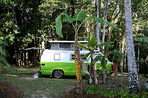 On reprend la route pour aller au Cape Tribulation et au parc national de Daintree, là où la fôret humide rejoint l’océan (et apparemment, à l’échelle mondiale, c’est plutôt rare). On passe un petit bac, ici ils aiment bien les bacs on dirait, ca fait comme un pont mais on peut faire payer les touristes… Du coup on prend aller simple. L’autre point d’accès est une piste (la Bloomfield track, on reparlera dans un prochain post…), au nord, en direction de Cooktown, « 4×4 only ». La guichetière regarde Bob d’un air dubitatif : « aller simple, vous êtes sûrs ?? Avec ce véhicule là… » On essaye de se renseigner sur la piste mais elle nous dit juste que c’est pentu et que des fois y’a de l’eau… Pas très précis.