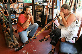 Après le Cape York on repasse faire un coucou à Jimmy et sa team de simili hippy à Kuranda. Il nous aide à fabriquer deux didgeridoos en pvc, pas très tradition mais bien plus léger pour emporter avec nous en Asie. On déforme un bout de chaque tube dans le feu avec un goulot de bouteille pour former une cloche d’amplification, il nous les accorde, un Ré et un Si, un peu de cire d’abeille pour l’embouchure et c’est fini. Pas tout à fait le même son bien sûr, mais c’est quand même pas mal. Va falloir qu’on continue à s’entraîner, mais on maîtrise déjà bien la technique de respiration circulaire.