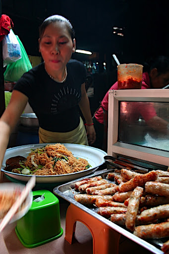 On va visiter le marché russe au sud de la ville, très coloré, il y a de tout, des pièces de mobylette aux imitations d’antiquités en passant par les poissons vivants, les poules suspendues par les pattes… On se pose dans la partie où on mange pour prendre un bo bun, et notre voisin de table entame la conversation, il parle très bien français « aaah vous êtes francais !! je croyais vous norvégiens car vous êtes tout petits !!! ha ha! ». Il nous explique qu’il a appris un peu de français sur le tas, puis il a obtenu une bourse pour aller prendre des cours accélérés pendant 6 mois à Paris « j’adooore Paris et la tour Eiffel ». Quand on lui dit que Clément n’est jamais monté en haut, il a du mal à ne pas s’étouffer ! « ahhhhh ah c’est rigoler ça, c’est très très rigoler !!!! ». A la fin du repas, il remet son masque de chirurgien, ses lunettes de soleil et sa visière. Difficile de continuer la conversation mais il n’a pas l’air de s’en rendre compte et continue à se marrer. Il nous quitte en disant qu’il va aller acheter des disques de Celine Dion au marché.